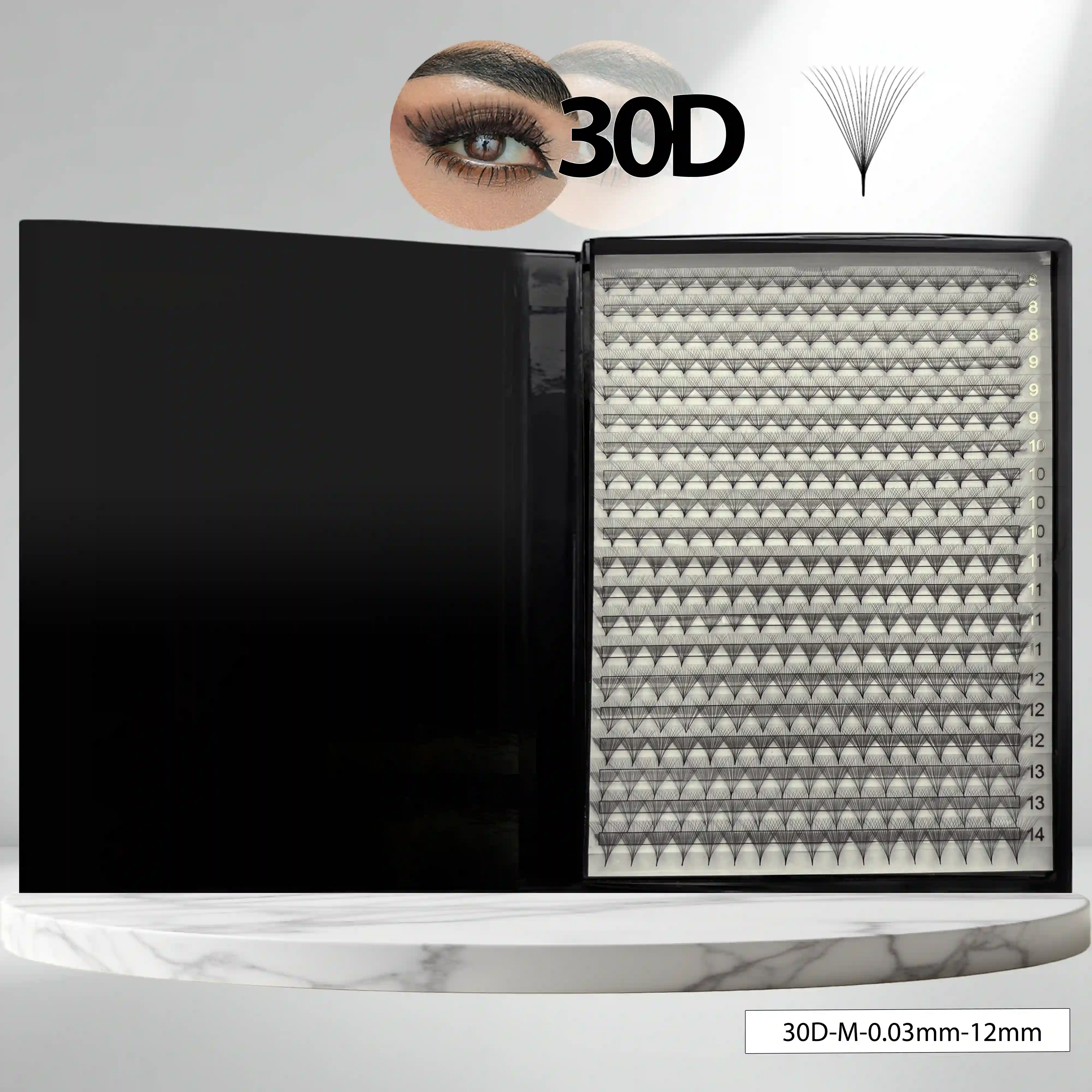 Rzęsy 30D ok.360 szt. M skręt 0,03 mm 12 mm czarne 20 pasków gotowe kępki